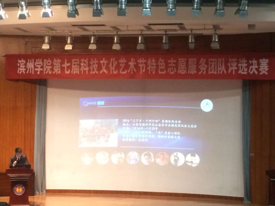 4月24日晚7点半,申慱sunbet娱乐于学苑会堂第二报告厅参加滨州学院第七届科技文化艺术节特色志愿服务团队评选决赛,我院赵志成代表“’机’承雷锋,’电’亮爱心”志愿服务团队上台答辩,我院共20名学生到场聆听。