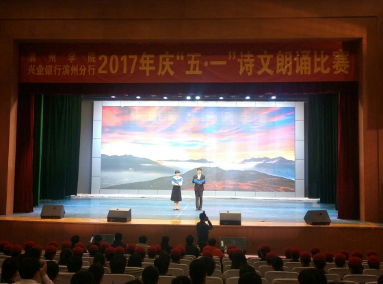 4月25日下午2点,申慱sunbet娱乐于学苑会堂参加了滨州学院庆“五一”诗文朗诵比赛,我院纪建茂、刘晓璐老师带着作品《光的赞歌》参加了此次比赛,我院部分老师以及50位同学到场观看。