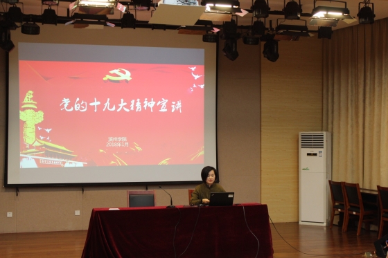1月5日晚7点半,我院于4教308参加滨州学院党的十九大精神校园宣讲会,本次报告会由人文学院韩安庄老师主持,外国语学院苏成荣老师和化学与安全学院张丛丛老师主讲,辅导员宋立军老师出席本次宣讲会,我院部分同学到场聆听学习。