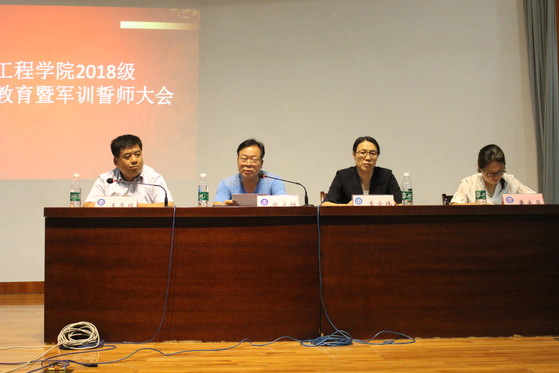 9月10日晚7点,学院在学院会堂第二报告厅召开2018级新生入学教育暨军训誓师大会,我院党总支书记张永胜,院长李宏伟,党总支副书记王丕琢,副院长黄爱芹,学生科科长宋立军,辅导员靳雪银、纪建茂以及学院的全体教师出席此次大会,2018级全体同学参加,16级17级部分学生干部负责会场秩序。