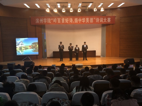 为弘扬中华民族优秀传统文化,提高学生的人文素质和道德情操,推动校园文化建设。12月13日晚七点,学院于五百人礼堂参加滨州学院“吟百首好诗,扬中华美德”诗词大赛决赛。我院18级温子寒等4名同学参赛,18级部分同学到场观看。