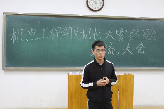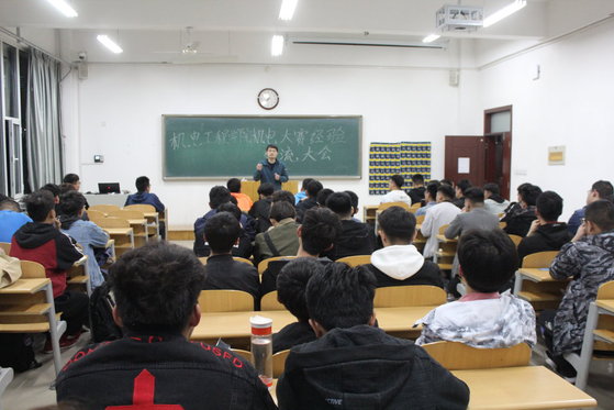 首先,牛得学老师讲述了在指导参赛学生的过程中,同学们所遇到的困难。还讲述了我院历年来参加比赛所获得的奖项和机电比赛的流程,介绍了参加机电大赛需要注意的事项和比赛规则。牛得学老师还讲述了一些关于设计产品的技巧。例如在设计实物的过程中可以参考其它的机械结构、制作过程中多思考多制作。最后,老师要求今后参加比赛的团队要认真学习优秀经验,查找自己的不足,进一步提升技能水平,争取为学校取得更多荣誉。其次,我院的孙启民,王占瑞,贻尹光同学分享了自己的参赛经验。孙启民同学就机电大赛的准备、制作、参赛等方面谈了自己的心得体会,王占瑞同学就机电大赛精挑竞赛题目、选题策略、内容构思、大赛信息获取的途径等做了详细描述。尹贻光同学就机电大赛的制作过程,对选题、视频拍摄、团队协作等深入谈出了切身体会。三位同学的经验分享让参赛同学有所借鉴。