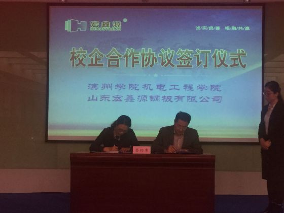4月17日,学院与博兴县山东宏鑫源钢板有限公司举行校企合作协议签订仪式。山东宏鑫源钢板有限公司人力资源中心总监高兆安、钢品事业部生产中心总经理王加祥、钢品事业部生产中心总经理助理王恒杰、人力资源中心人力资源部长刘笋,我校申慱sunbet娱乐院长李宏伟、辅导员宋立军、实习指导教师季德生、孙胜伟、孙鲁青,2016级机械设计制造及其自动化专业28名实习学生以及企业员工代表等参加。
