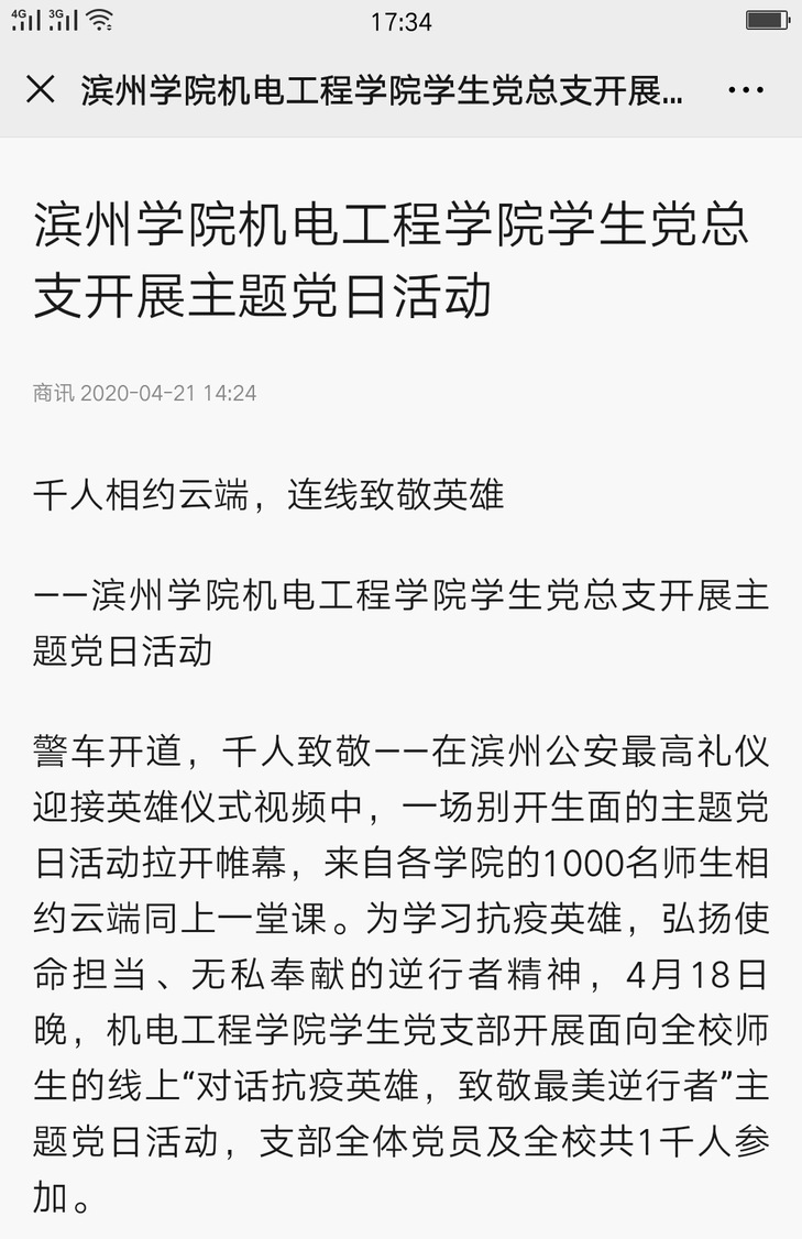 4月18日晚,学生党支部开展面向全校师生的线上“对话抗疫英雄,致敬最美逆行者”主题党日活动,支部全体党员及全校共1千名师生参加。山东省第八批援鄂医疗队队员、滨州市第四批援鄂医疗队队员、阳信县人民医院呼吸内科副主任王艳贞医生上了题为《我们回来了,依然是一身白衣》的主题党课,学生党支部向王艳贞医生送上了带有全体党员点赞照片和电子签名的致敬卡片,并向最美逆行者表达了他们最崇高的敬意。