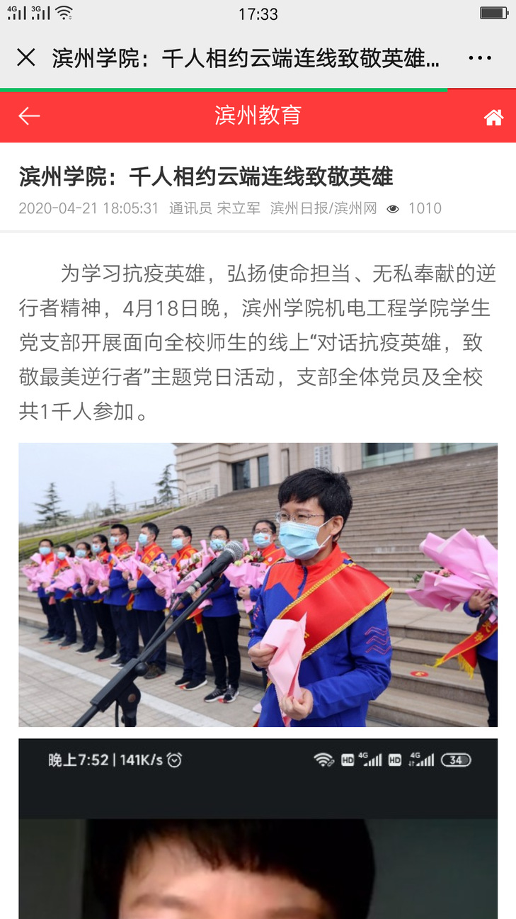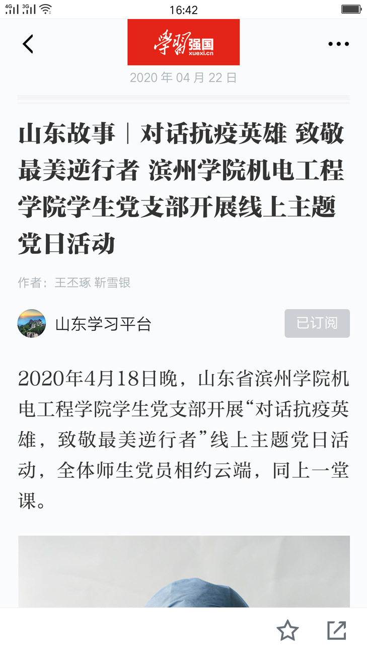 近日,我院学生党支部开展的“对话抗疫英雄,致敬最美逆行者”主题党日活动效果显著,现已被学习强国、新浪网、滨州日报等多家主流媒体广泛宣传报道,引发社会热烈反响。