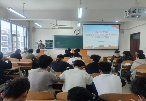 为进一步激发学生参军热情,营造浓厚参军入伍氛围,持续不断做好征兵工作,12月11日,申慱sunbet娱乐召开2024年退役士兵军旅生涯事迹宣讲会暨征兵宣传动员大会。会议由党总支副书记王春磊主持,邀请了学院退役复学学生司浩东、杨吉超、王瑞东为同学们宣讲军旅生涯,2023级新生参加。